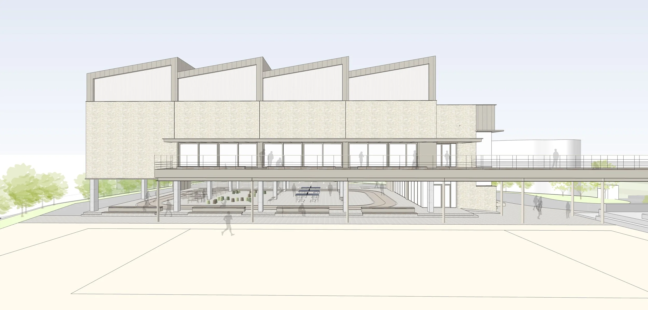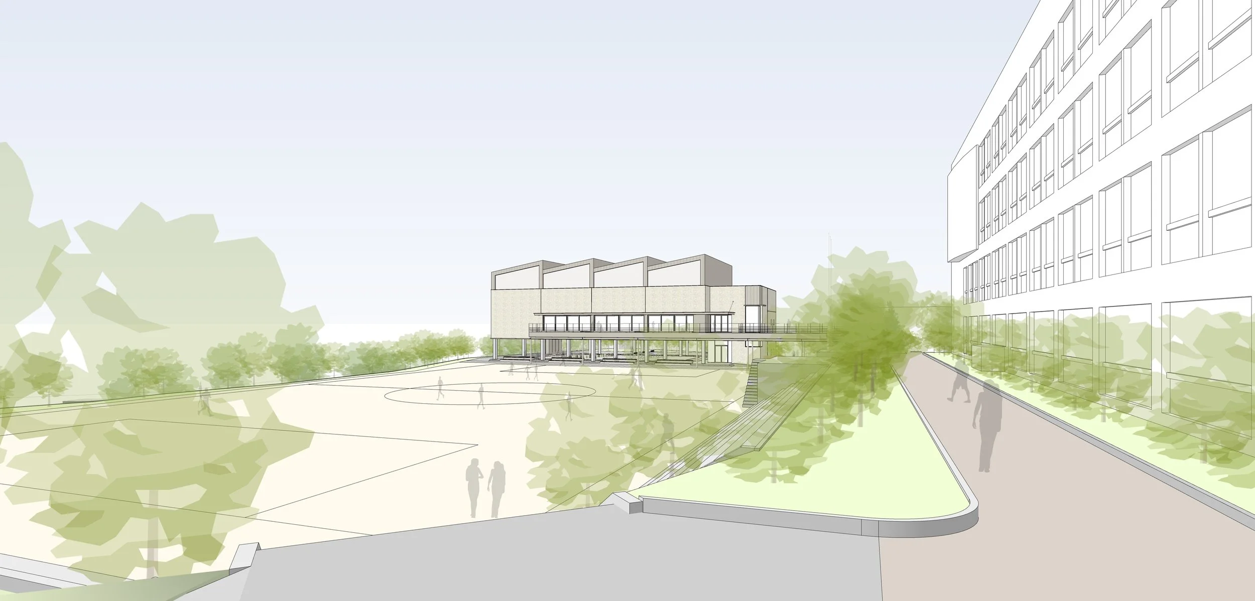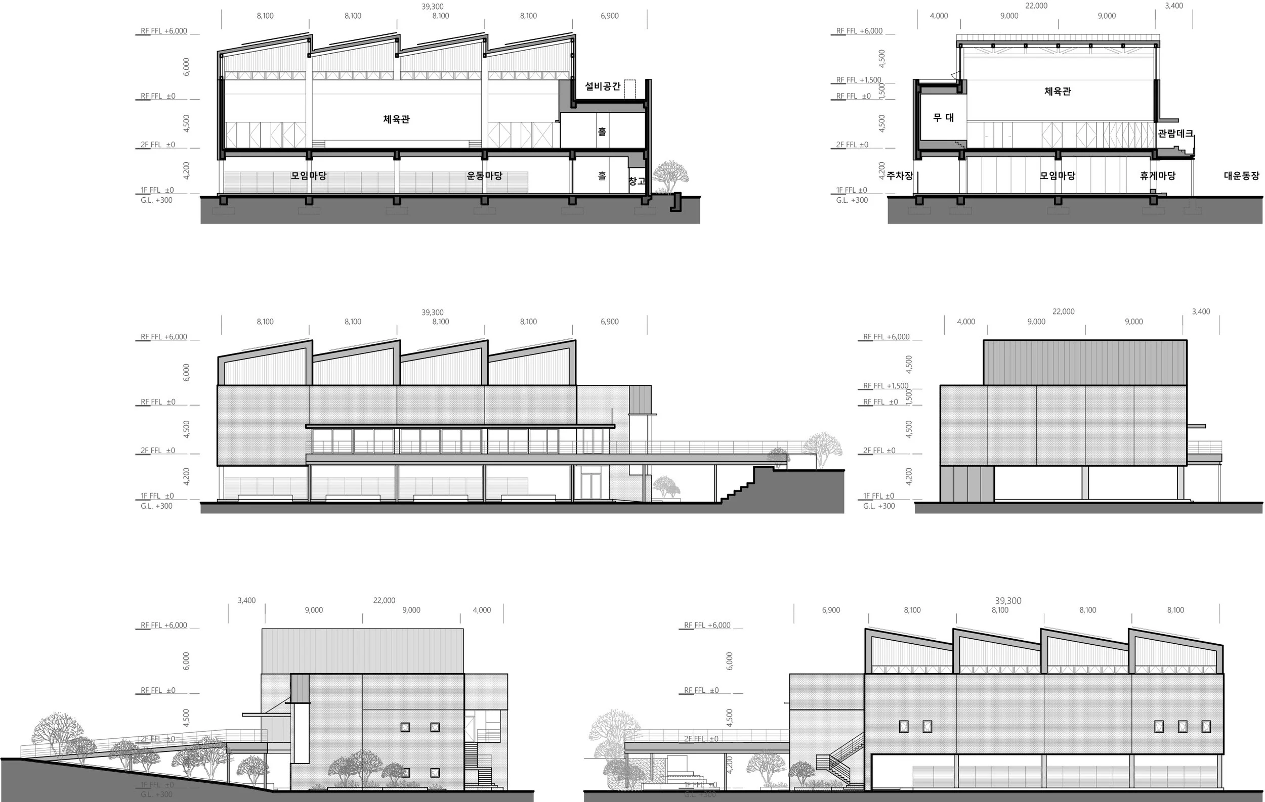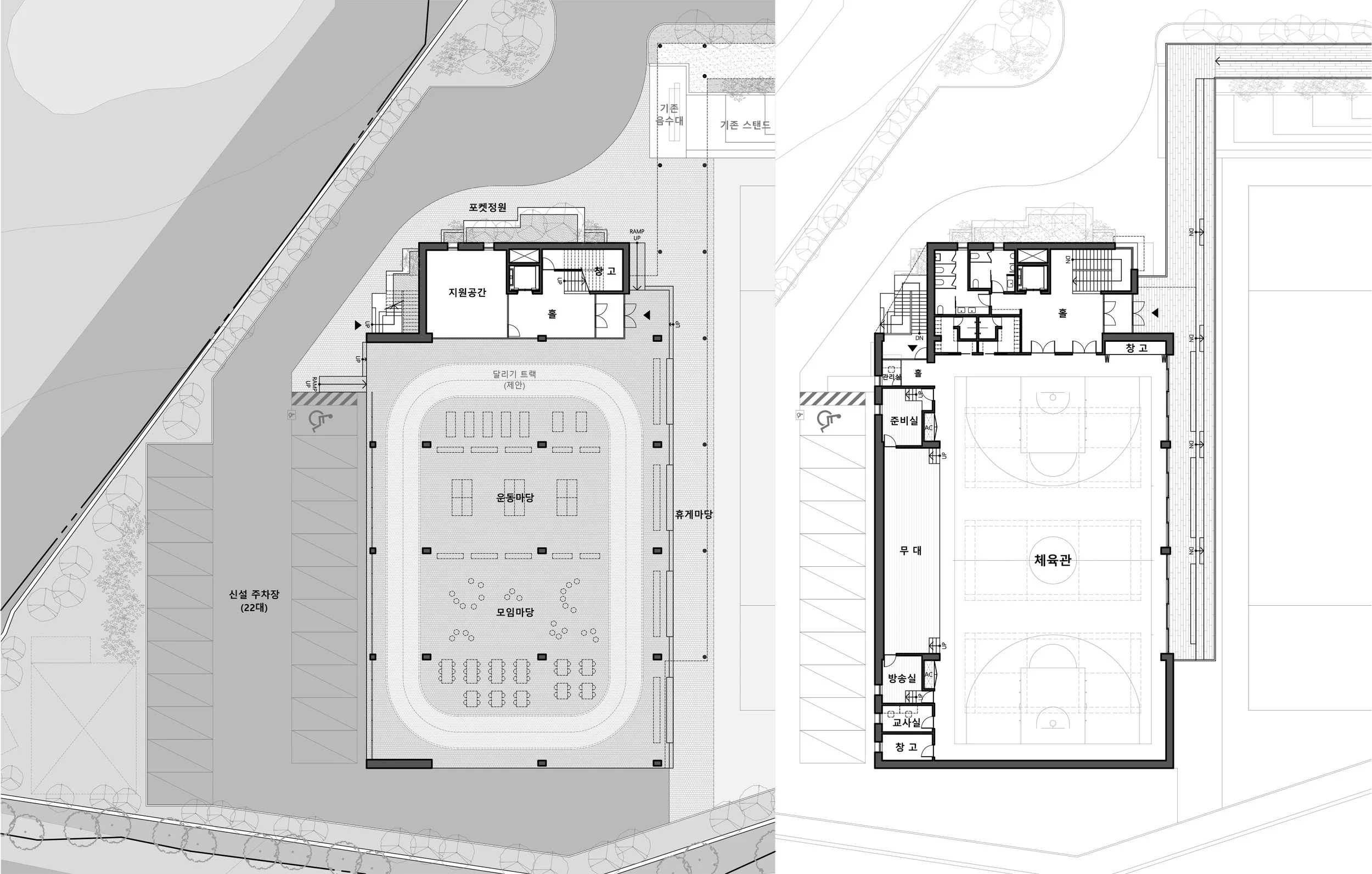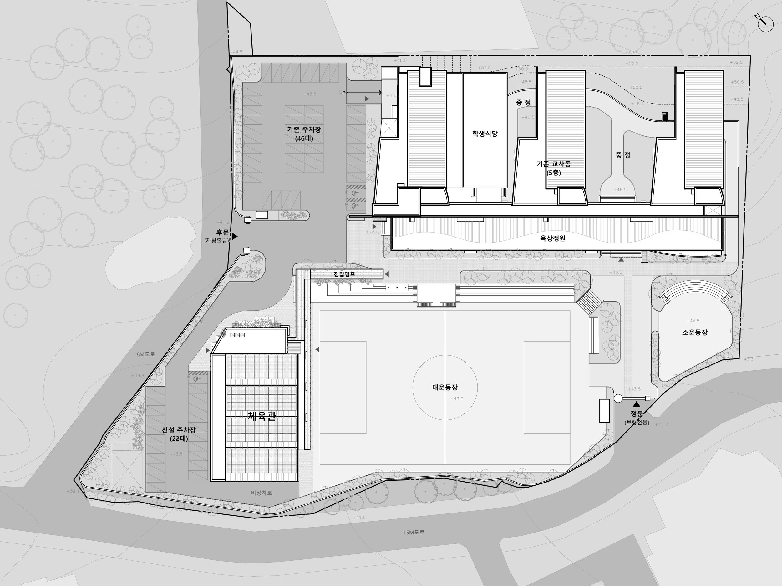 체육관은 주변보다 지붕을 높이고 충분한 채광을 위해 양측 벽면을 반투명 폴리카보네이트로 계획했으며, 그 외 서비스 공간은 필요한 만큼만 층고를 설정하되 옥상 설비를 차폐할 수 있을 만큼만 벽을 세웠다. 교내 단차를 이용해 교사동 1층 레벨에서 체육관 2층으로 바로 갈 수 있는 외부 브릿지는 기존 스탠드와 음수대에 최대한 간섭되지 않으면서도 주변 조경과 조화롭게 뒤섞일 수 있도록 그 위치를 정했다. 라이트한 철골구조의 브릿지는 체육관 전면의 관람데크로 자연스럽게 이어지며 여유로운 산책로 겸 휴식과 교류의 공간으로 기존 학교에 자연스럽게 녹아들 수 있도록 했다.