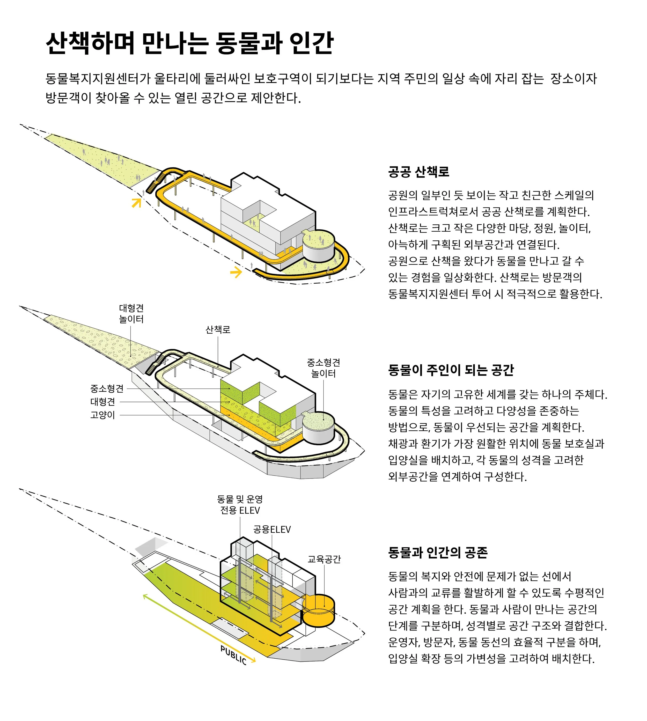동물은 움직여야 산다. 움직이면서 세상과 만난다. 동물, 인간이 할 수 있는 가장 원초적인 운동 중의 하나는 걷는 것이다. 동물과 인간은 각자의 범위로 움직이며 자기만의 산책을 한다. 고양이는 영역 안에서 어슬렁거리며 때로는 재빠르게 돌아다니고, 개는 생물학적 특성상 일생동안 하루도 거르지 않고 산책해야 한다. 인간은 야외로 나가 천천히 거니는 것만으로도 스트레스 지수를 낮추고 신체적, 정신적인 건강을 호전시킨다. 산책은 단순히 걷는 것이 아닌, 주변 환경과 끊임없이 소통하며 자연과 교감하는 활동이다. 새로운 동물복지지원센터 강동은 모두를 위한 산책로를 중심으로 계획함으로써, 이를 매개로 동물과 인간이 서로가 주변에 존재하고 있음을 깨달으며, 자연스럽게 존재를 긍정하고, 우연한 만남을 통해 동물과 사람 모두를 위한 치유의 공간이 될 수 있도록 제안한다.