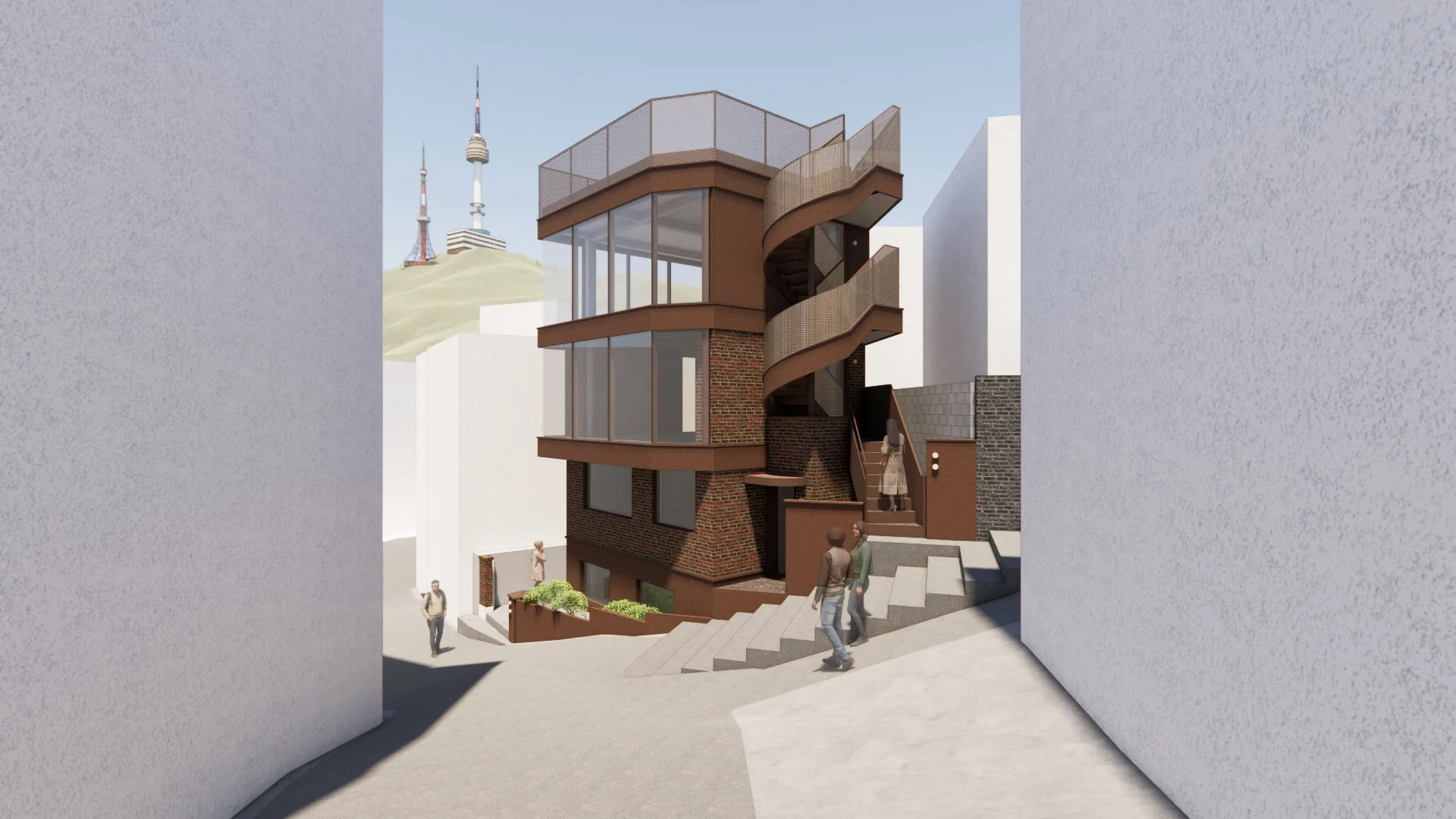 리노베이션은 골목과 기존 건물이 맺는 관계를 새롭게 구성하는 것에서부터 시작되었다. 주택으로 쓰이던 시기, 프라이버시 보호를 위해 보행 레벨에서는 거의 닫혀있던 건물을 골목에 열어주고자 했다. 건물 외곽의 담장을 일부 철거하여 숨어있던 반지하층의 외벽과 창문을 드러내고, 경사지의 단차를 활용해 지상 1층에는 서로 다른 레벨에서 접근할 수 있는 출입구를 추가했다. 새로 증축되는 3층과 옥상으로 이어지는 외부 나선계단은 기존 2층 출입 계단이 있던 대지 모서리에 두어 협소한 비정형 대지를 효율적으로 활용하면서도 골목의 흐름이 건물 외부를 따라 옥상까지 자연스럽게 이어지도록 했다. 방문자들은 계단을 오르며 주택가의 좁은 골목에서부터 남산을 향해 점차 열리는 도시의 풍경을 경험하게 된다.