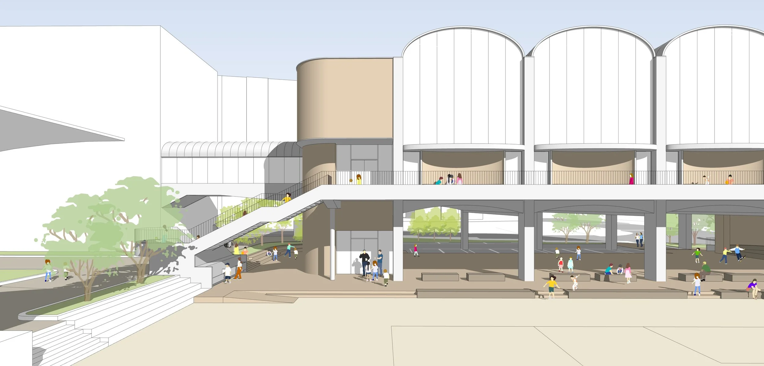 반원보다는 좀 더 완만한 반타원의 곡면 지붕을 가진 네 개의 매스는 양측 외벽을 반투명 복층 폴리카보네이트 패널로 마감해 체육관 내부로 균질하면서도 충분한 빛을 들이고자 했다. 언뜻 비닐하우스 같기도 하고, 식빵처럼 보이기도 해서 학생들이 몇 번째 식빵 앞에서 만나자고 약속하는 모습도 아주 잠깐 상상해 보았다. 또한 운동장 스탠드 근처 외부계단은 음수대를 감고 올라가면서 그 계단참은 교사동을 향해 살짝 돌출되는 미니 구령대처럼 계획하여 이동 동선과 교류의 기능을 겸하게 했다. 연결통로 아래에는 교내 레벨차를 이용해 소규모 야외수업이나 그룹 활동, 휴식을 위한 작은 커뮤니티 마당을, 체육관 하부 필로티는 운동장과 연계하여 이벤트 마당으로 활용할 수 있도록 한편에 작은 무대를 만들었다.