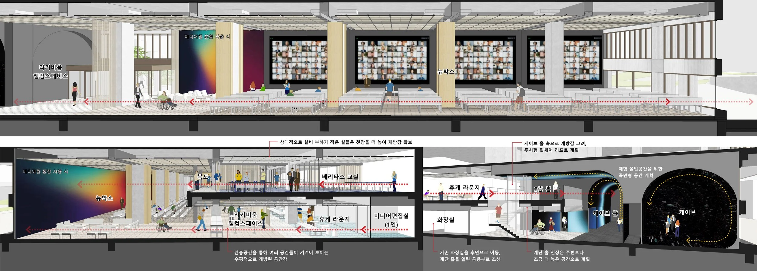 도서관은 책을 저장하고 열람하는 공간을 넘어 정보와 지식을 적극적으로 교류하며 소통하는 공간으로 바뀌고 있다. 기존 도서관 본관이 마스터플랜과 프로그램 조닝의 큰 단위에서 계획되었던 것과 다르게, 스누커먼즈의 라키비움과 베리타스 교실은 작은 단위에서 사용자의 경험을 적층하는 것으로 공간 계획을 시작한다. 인간 중심의 미래 교육이 나아가는 방향은 다양성을 존중하는 유연함을 담은 공간을 필요로 한다. 장기적인 변화를 고려하여 철거와 재사용을 전제로 계획하며, 단단하지만 가벼운 장치와 시스템을 제안한다.