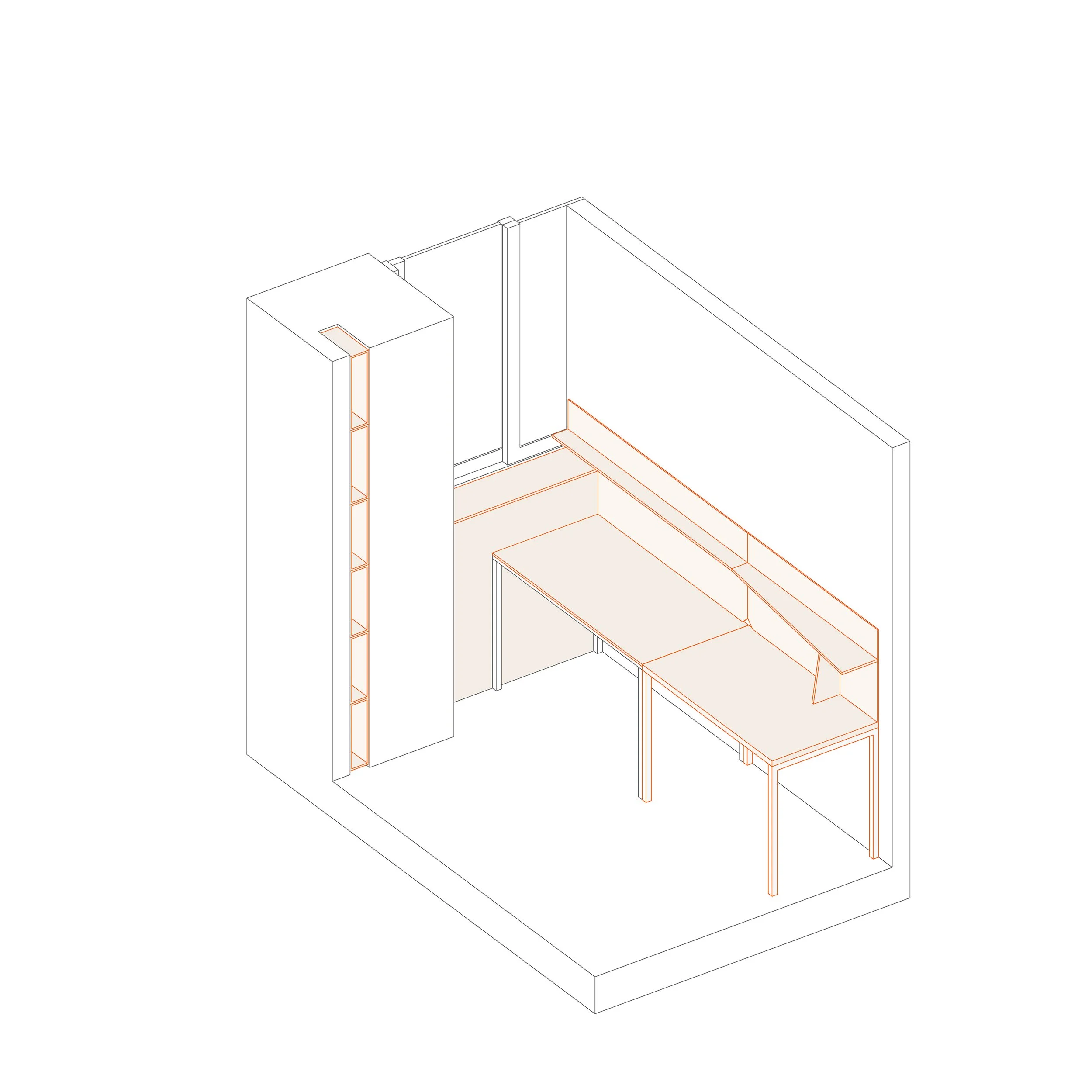 작업 공간을 최대한 확보하고 바깥 풍경을 자주 보기 위해 창문 옆 가장 긴 변을 따라 책상 두 개를 배치했다. 앉았을 때 손과 눈길이 닿는 곳은 모두 합판으로 마감해 가구, 파티션, 창가가 일체화되도록 했고, 마음이 가는 어떤 아늑한 구석을 만들고자 했다. 책상 전면에는 얕은 깊이로 시작해 문쪽으로 갈수록 깊어지는 선반을 파티션과 한통으로 만들어 기존 벽에 기댈 수 있게 했다. 선반이 제일 깊어지는 부근에는 사다리꼴 모양의 합판을 덧대어 선반+파티션을 지지하도록 했다. 기둥 옆 남는 좁은 공간은 6개의 박스를 끼워 넣어 틈새 책장으로 활용했다.